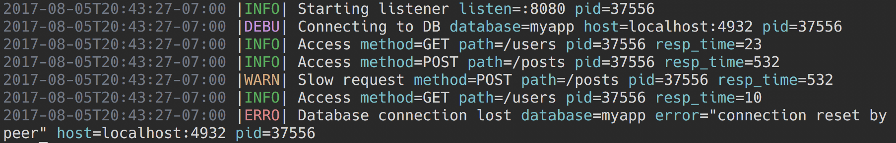 To keep the code base and the API simple, zerolog focuses on efficient structured logging only. Pretty logging on the console is made possible using the provided (but inefficient) zerolog.ConsoleWriter.